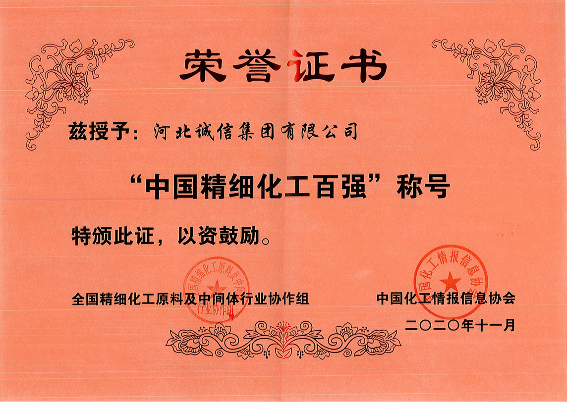“中国精细化工百强”企业代表着我国精细化工行业的最高水平,是推动中国化工行业转型升级的重要力量。河北诚信集团扎根精细化工30年,持续开展科技研发、延伸产品链条、优化产品结构,走出了一条创新驱动、转型升级之路。公司连续3年入围中国精细化工百强,荣膺“高新技术企业”、“国家技术创新示范企业”、工信部 “绿色工厂”称号,拥有国家企业技术中心和国家认可实验室(CNAS),产品畅销海外60多个国家和地区。
